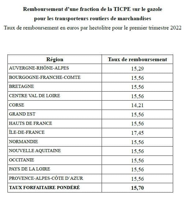 Une circulaire du 15 février 2022 présente les taux de remboursement d’une fraction de la taxe intérieure de consommation (TICPE) sur le gazole utilisé par les transporteurs routiers de marchandises et de voyageurs pour le premier trimestre 2022.