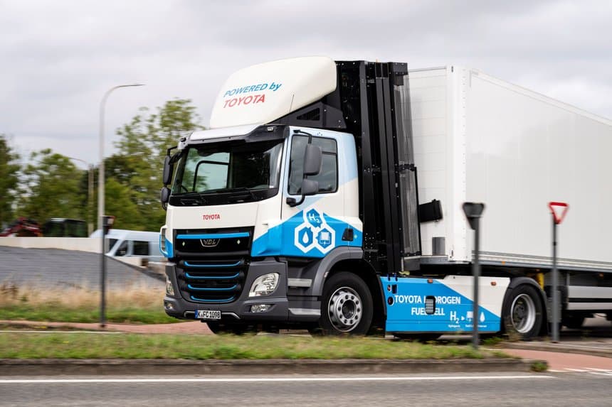 Diest, en Belgique. Au centre principal de pièces détachées de Toyota pour l’Europe (TPCE), Neil a bouclé son chargement. Le chauffeur tourne la clé de contact, pas de ronronnement… le silence. Avant d’enclencher la marche avant, il jette un coup d’œil sur un étrange écran tactile placé sur sa droite. Tous les voyants sont au « vert ». Le poids lourd de 40 t s’élance sans un bruit. Sa destination : un dépôt Toyota situé à Amsterdam à environ 200 km. Sur l’autoroute, les kilomètres défilent. Un coup d’œil dans les rétros et lors d’une accélération, au lieu des volutes grasses de combustion, un étrange panache blanc s’envole. C’est celui d’un nuage de vapeur d’eau.