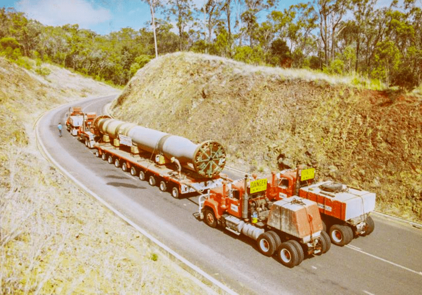 Pendant ce temps, en Australie, on s’active sur un monumental chantier, celui de la centrale hydroélectrique du barrage de Wivenhoe, près de Brisbane. Un barrage en terre, achevé en 1985, qui abrite une centrale à accumulation ayant nécessité l’acheminement de nombreuses pièces lourdes. Comme cette colonne, transportée par la compagnie Brambles, à l’aide d’un ensemble très « australien » puisque la remorque Drake et le tracteur de tête Leader sont de conception et de fabrication locale. Leader a depuis disparu, mais Drake Trailers reste l’un des principaux constructeurs de remorques et semi-remorques du pays pour le transport d’engins et de masses indivisibles.