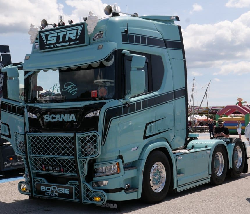 Le patron accorde aux chauffeurs en qui il a confiance de personnaliser leur véhicule, en conservant comme base cette peinture « entreprise » verte qui tend vers le bleu, et l’esprit tuning. Pour le reste, Rémi a pioché les accessoires comme le pare-buffle, la casquette, les bibendums, stickers, trompes et gyrophares sur les sites spécialisés, et les a installés lui-même. Le résultat, c’est ce tracteur tuning old school plutôt réussi.