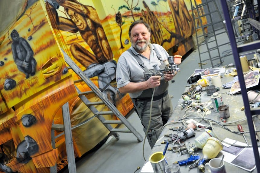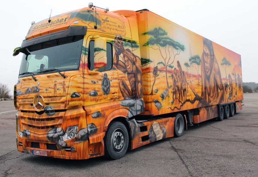 7 semaines et 35 litres de peintures ont été nécessaires pour réaliser cette œuvre baptisée Berceau de l’humanité. Le camion propriété des transports Josef Schumacher a été présenté dernièrement au carnaval d’Aix-la-Chapelle, en Allemagne. Une véritable Histoire de vie à quatre roues ! C’est le peintre aérographe Walter Rosner qui en est l’auteur.