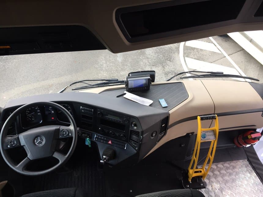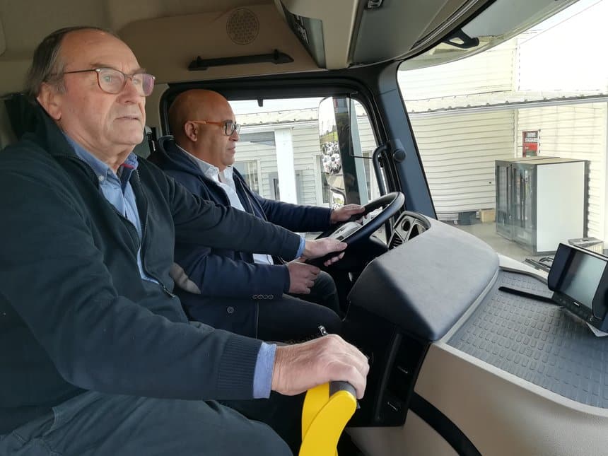 Mais cet Actros est particulier. Le centre de formation ECF Roudaut voulait un dispositif qui apporte un plus en matière de sécurité. « Nous avons travaillé pour transformer cette configuration initiale dans un but sécuritaire : que le siège du formateur soit installé au centre afin qu’il puisse avoir une vue sur la planche de bord et intervenir au besoin directement sur le volant voire freiner, explique Roger Roudaut, président de l’entreprise ECF Roudaut. Nous avons donc inventé une commande manuelle pour le freinage, en lieu et place du frein au pied, habituellement placé face au passager, double commande oblige ».