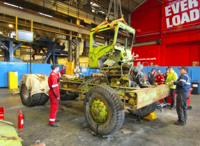Car après trente ans de dur labeur dans une carrière écossaise, suivis d’une longue période d’abandon, ce vénérable dumper n’était pas dans une forme éblouissante. Voyez plutôt !
