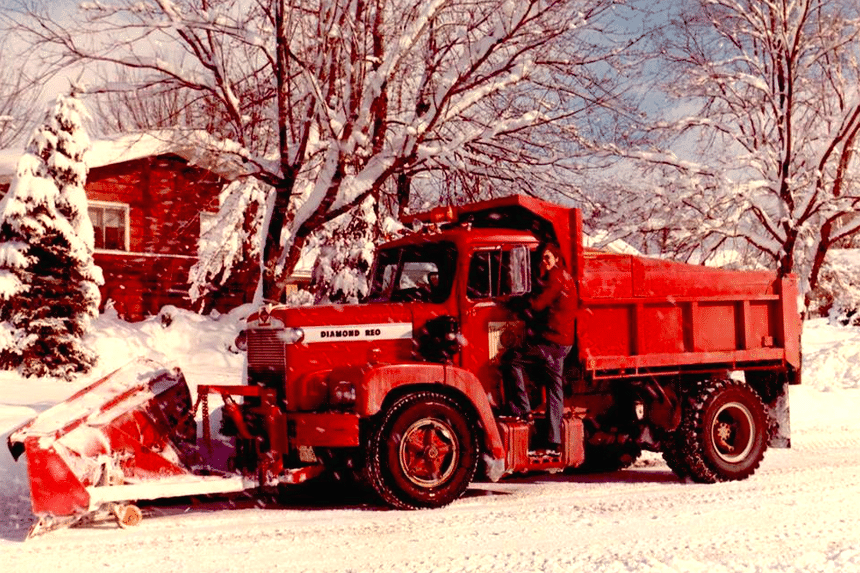Et maintenant, juste pour le plaisir, voici un autre Diamond Reo, surpris dans un emploi plus habituel pour lui : le déneigement des routes en hiver. Une photo prise dans l’Illinois, au début des années 70.