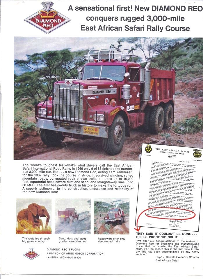 Curieusement, le premier constructeur de poids lourds à relever le défi de l’East African Safari ne fut pas anglais ou européen, mais américain. Il s’agissait de Diamond Reo, une marque réputée mais assez modeste, qui avait engagé un 6×4 de série, carrossé en benne. Rien à voir donc avec les « bêtes de course » qui tiennent aujourd’hui tête aux voitures dans le Dakar. Mais tout de même, une sacrée preuve de robustesse et d’efficacité que l’entreprise s’empressa d’exploiter par la suite, comme le montre cette publicité, parue dans la presse spécialisée aux États-Unis.