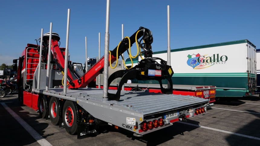 Du matériel de pro. A l’arrière, la dimension professionnelle de la carrosserie prend tout son sens : CVIM a installé sur le châssis un plateau de 7 mètres de longueur, d’une capacité de 8 tonnes, hérissé de deux rangées de quatre hauts ranchers, et une grue Palfinger Epsilon de 17 t.m, équipée d’un grapin tronçonneuse Hultdins.