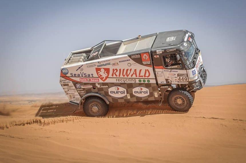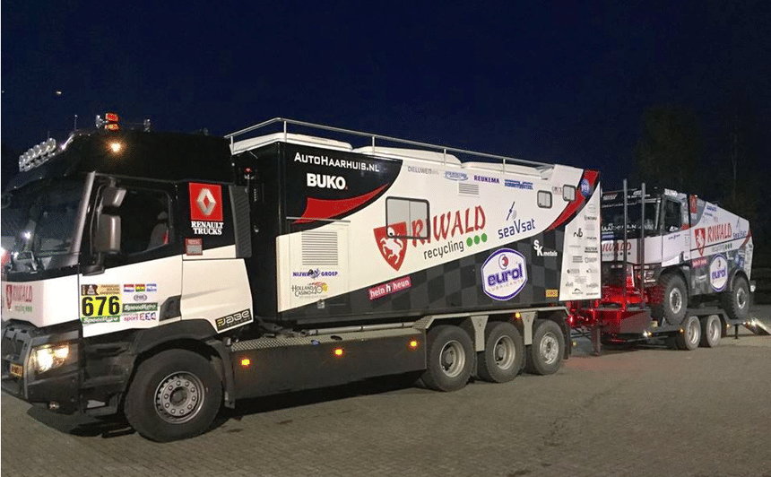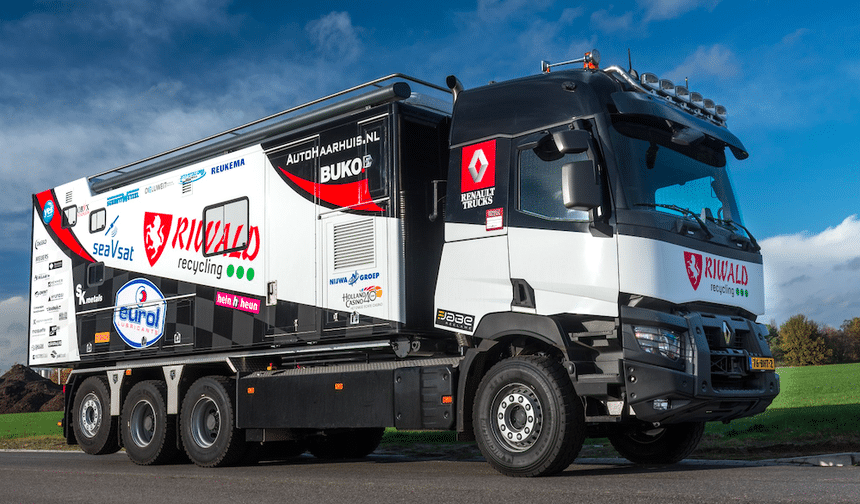Le choix du C520 8×4 tridem a été mûrement réfléchi et sa préparation confiée à Nijwa Groep, concessionnaire Renault Trucks/Volvo Trucks à Hengelo, aux Pays-Bas. Elle comprend notamment un pare-chocs renforcé (celui de la série K) et un réservoir à carburant de 1 200 l avec pompe et filtres supplémentaires. Le circuit de refroidissement a également été renforcé, de même que la transmission Optidriver. Le fourgon-atelier arrière abrite entre autres un générateur électrique et une cuisine tout équipée. Ce fourgon est par ailleurs amovible au moyen d’un système à câbles réalisé par HTS/NCH. Ce qui permettra au groupe Riwald, après le Rallye, d’intégrer ce Renault dans leur flotte où il travaillera avec une benne déposable grand volume. Le métier de base de l’entreprise étant le recyclage des métaux.