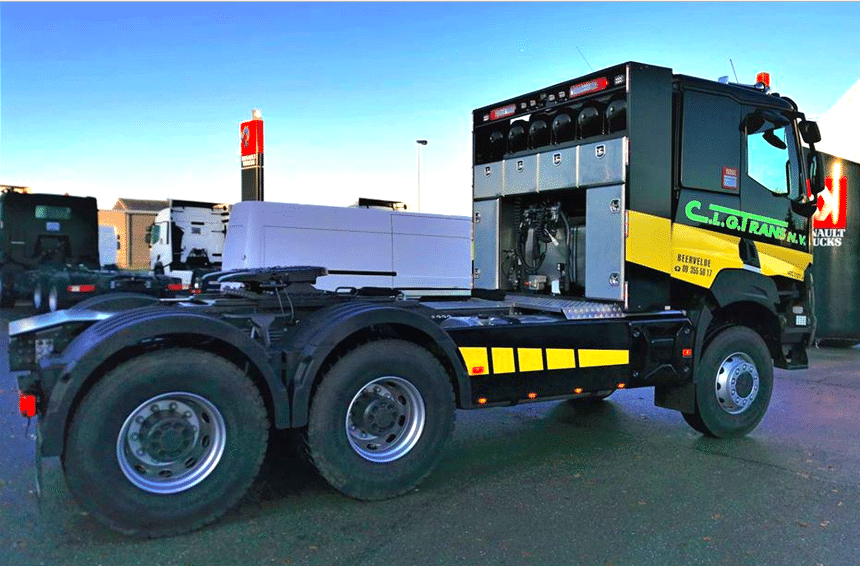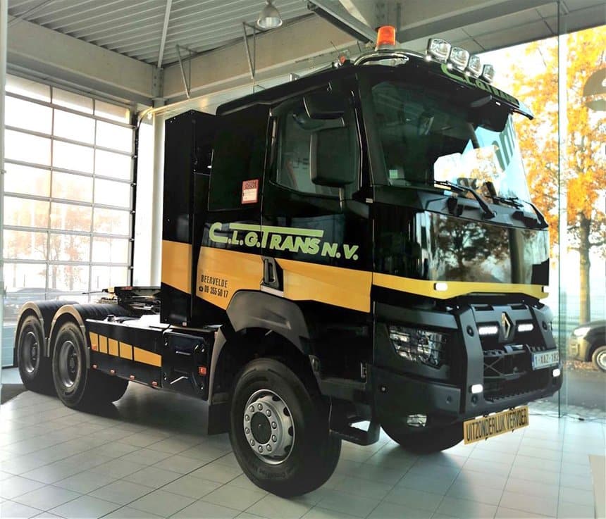 Toujours en Belgique, mais dans un tout autre registre, Renault Trucks a livré, il y a quelques mois, un modèle aussi rare (en Europe) qu’impressionnant : un K550 en configuration tracteur 6×6. Homologué au PTR de 150 t, il est utilisé par l’entreprise de terrassement C.L.G. Trans, pour le transport de ses engins. On le voit, ci-dessus, peu avant sa livraison, dans le showroom d’ATC Van Damme.