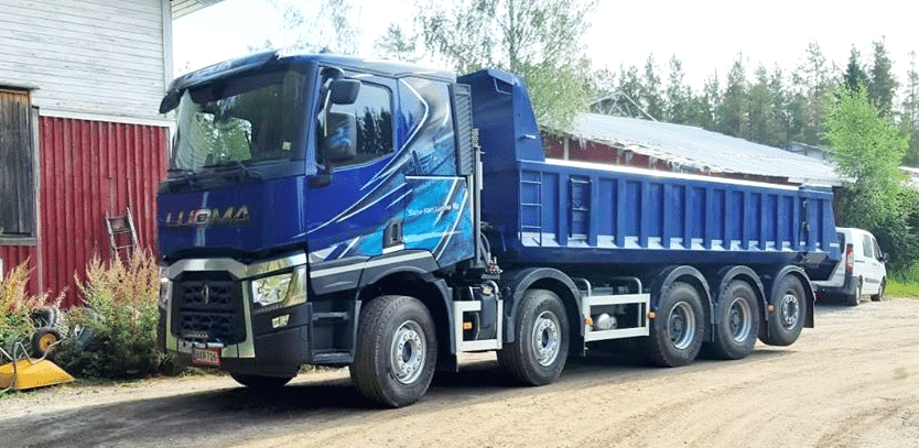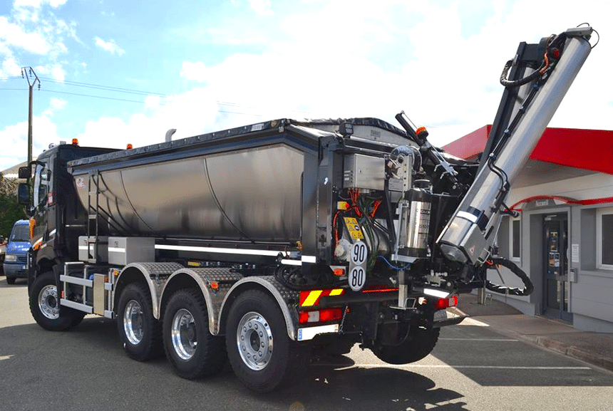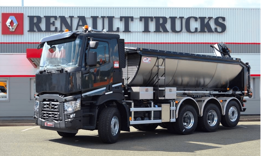 Plus courante, la configuration 8×4 tridem de ce C440 français, livré par Renault Trucks Dreux, est remarquable par sa carrosserie : une benne calorifugée pour enrobé CIF dotée d’un bras et d’une vis convoyeuse conçus par Theam pour faciliter la mise en place des matériaux. De plus, ce porteur peut être doté d’un système d’avancement hydrostatique radiocommandé pour les phases de travail.