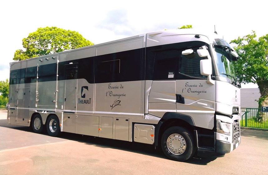 Autocar de luxe ? Presque, mais pour des passagers hors du commun : ce Renault T High 6×2, dont l’apparence se trouve totalement transformée par sa carrosserie intégrale, est destiné au transport de chevaux de compétition.