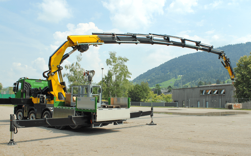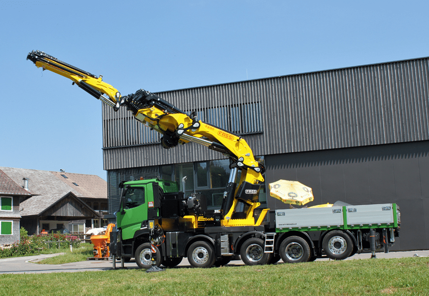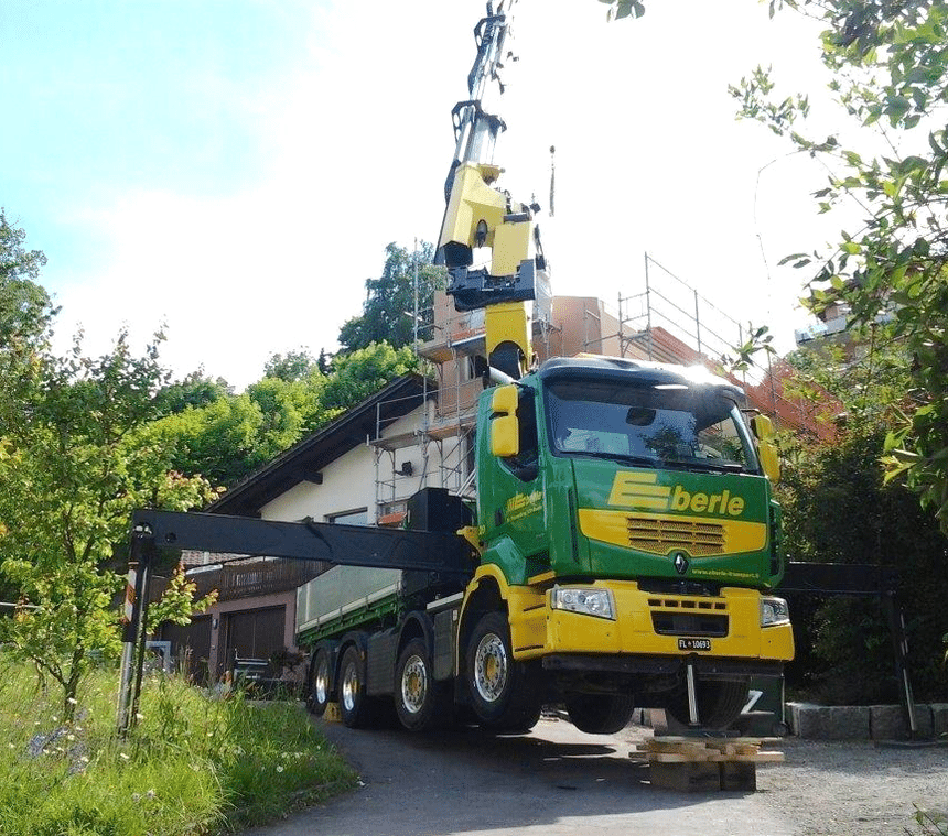 La grue repliable Fassi F2150RA.2.28 xhe commence à être ce que l’on peut appeler une « grosse » machine. Avec une capacité nominale de 160 t.m et un bras hydraulique pouvant aller jusqu’à 31,3 m (41,3 m avec jib), elle offre d’immenses possibilités de travail. Reste que son poids propre n’est pas anodin. Entre 13 t et 16 t selon les versions. Aussi, si l’on veut conserver un minimum de capacité de transport au camion qui la porte, faut-il taper dans les grands multi-essieux. Comme ici un 10×4 de 40 t de PTAC, valeur légale en Suisse et au Lichtenstein. C’est justement au Lichtenstein, petite principauté enserrée entre la Suisse et l’Autriche, que la société Eberle Transport vient d’en mettre une en service, la plus puissante de son parc.