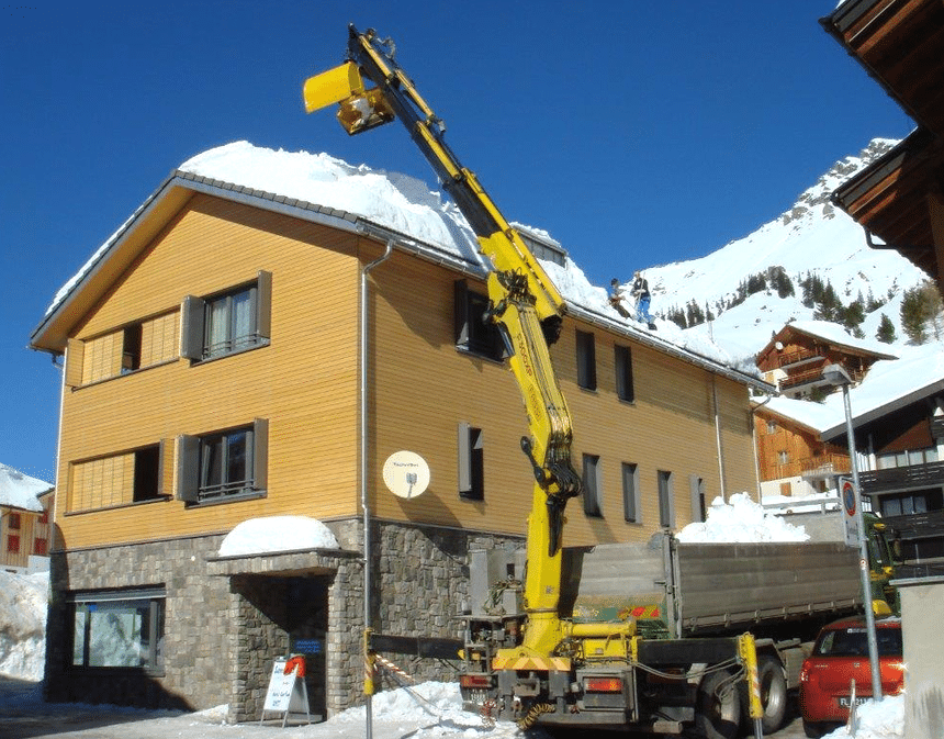 Parfois, ces grues sont utilisées à des tâches un peu inhabituelles, mais classiques en haute montagne, comme ici avec une benne preneuse travaillant… en hauteur ! Il s’agit en effet de déneiger une toiture après de fortes précipitations neigeuses.