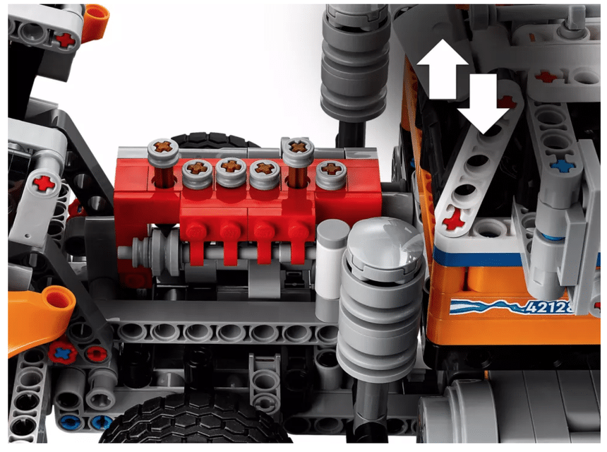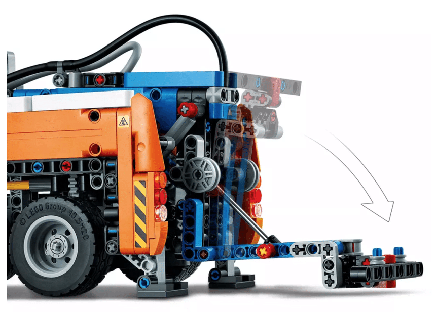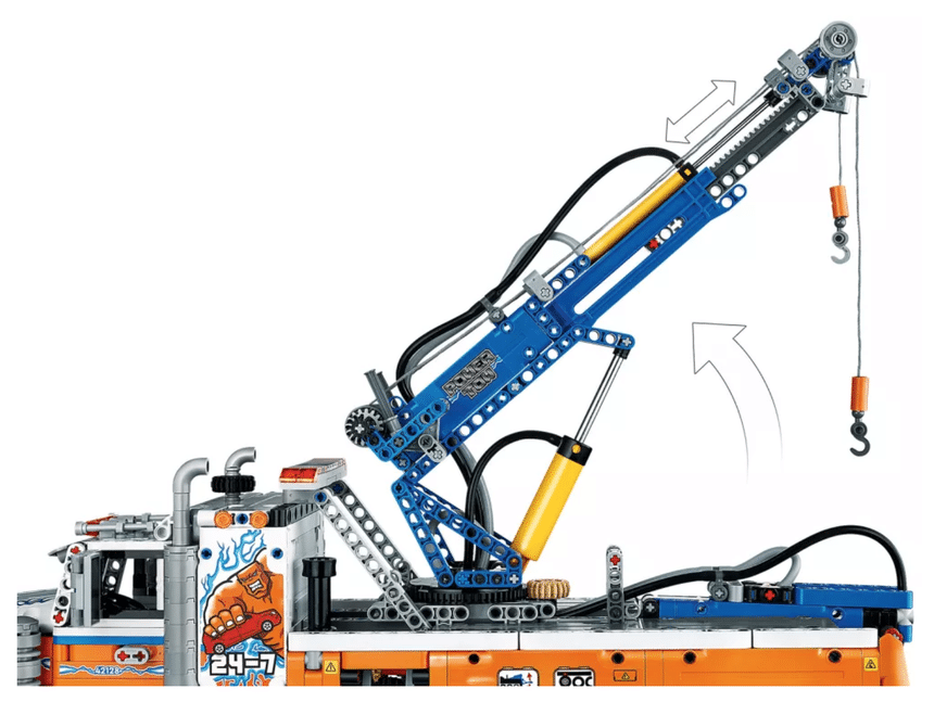 Dirigez-le en faisant tourner la tige sur le toit. Actionnez la grue rotative, étendez la flèche, sortez le treuil et déployez les stabilisateurs. L’un des essieux se soulève et permet d’abaisser des roues pour équilibrer le poids des charges : une première pour LEGO Technic !