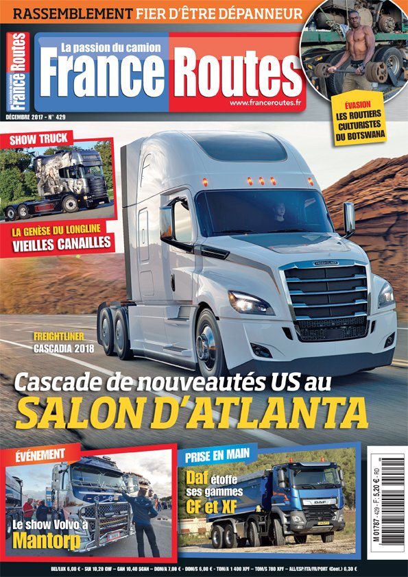 En décembre 2017, FranceRoutes publiait en Une de sa couverture le nouveau Freightliner Cascadia, et le présentait dans le reportage exclusif publié sur le premier salon NACV d’Atlanta (pages 28 à 31).