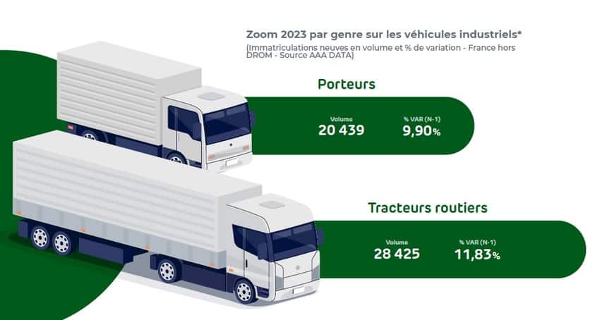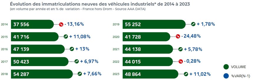 Camions, bus, autocars : hausse de 11,8 %. Avec 48 864 immatriculations dans l’Hexagone, le marché des poids lourds (PL) de plus de 5,1 t enregistre une hausse de 11,02 % par rapport à 2022, marquant une reprise nette après plusieurs années de fluctuations.