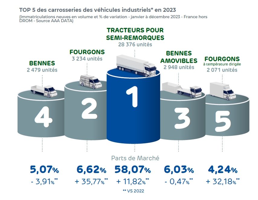 Les porteurs restent dans la roue. Le marché des porteurs a connu également une belle année 2023 avec 20 439 unités, en hausse de 9,9 % par rapport à 2022, mais c’est sur ces véhicules que se concentrent les accroissements des délais de livraison liés au carrossage.