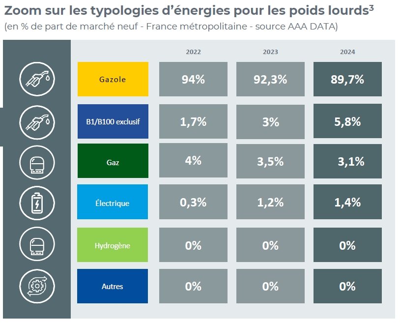 Dans le détail, cette progression est effectivement réelle, mais encore à la marge : le B100 exclusif grimpe à 5,8 % de parts de marché (PDM), et l’électrique à 1,4 %, tandis que le gaz stagne à 3,1 %. Mais il est vrai que le gasoil est descendu de 94 % de PDM en 2022 à 89,7 % en 2024.