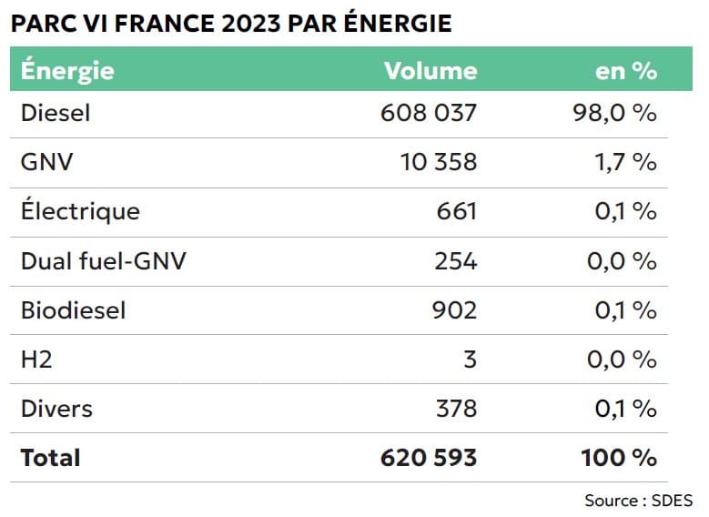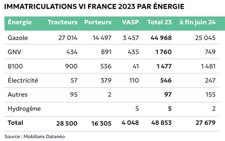 D’après le baromètre Mobilians/FFC Constructeurs, sur les 27 679 VI immatriculés entre janvier et juin 2024 en France, 247 fonctionnaient exclusivement à l’électricité (véhicules BEV comme battery electric vehicles), 2 à l’hydrogène (véhicules FCEV comme fuel cell electric vehicle) et 25 045 au gasoil.