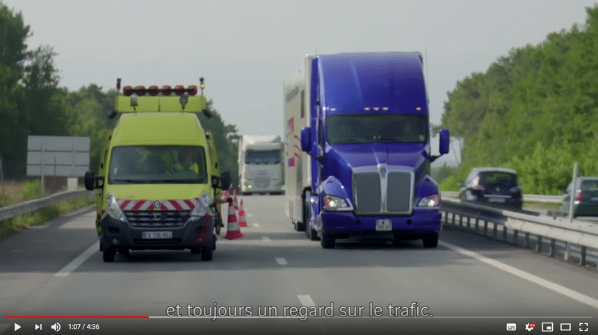 Regardez cette vidéo… mais surtout pas si vous conduisez ! Et d’ailleurs, n’utilisez pas votre smartphone quand vous conduisez ! C’est la conclusion qui s’impose avec ce « Vis ma vie » dans lequel trois femmes et hommes en jaune échangent leur métier durant une journée avec trois conducteurs de poids lourd. La mission de ces derniers, dans le véhicule utilitaire d’intervention sur autoroute, est de poser des cônes afin de sécuriser une voie de circulation d’autoroute d’1 km de longueur, alors que les camions comme les autos défilent sur la voie d’à côté. « Impressionnant », lâche Mikaël Moitel, l’un des pros de la route, que nous connaissons bien puisqu’il a été élu Conducteur de l’année FranceRoutes en 2017. On voit, grâce aux excellentes prises de vues, que les camions passent tout près d’eux, on sent le souffle, on comprend le danger de cette activité.