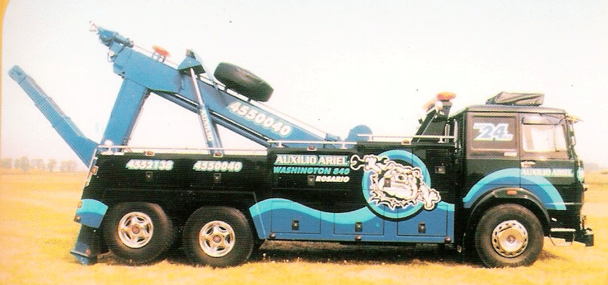 Le premier, le plus soigné et le plus récent, est carrossé en dépanneuse avec un équipement plutôt moderne, à bras hydraulique télescopique et deux treuils, monté sur un châssis 6×2 dont l’essieu arrière relevable et l’empattement allongé ont été réalisés localement (le 619 étant d’origine un porteur ou un tracteur, mais toujours un 4×2).