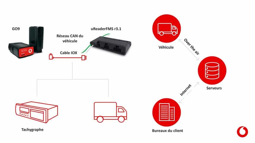 - les boitiers uReader et GO9, connectés au chronotachygraphe et au véhicule (OBD, FMS ou CAN bus), qui lisent, chargent à distance et transmettent les données ;