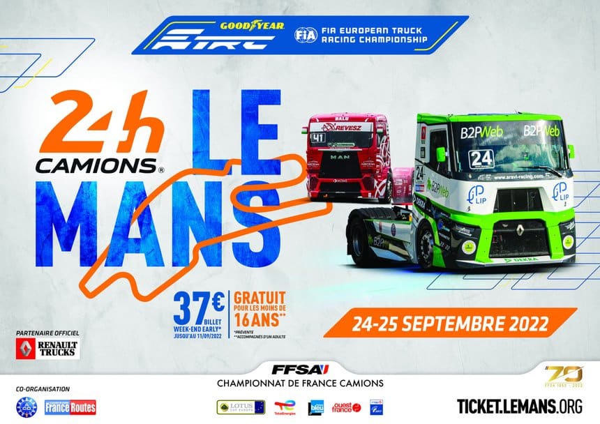En avant-première, on vous dévoile aujourd’hui l’affiche officielle des 24 Heures Camions qui se dérouleront les 24 et 25 septembre prochains sur le Circuit Bugatti au Mans !