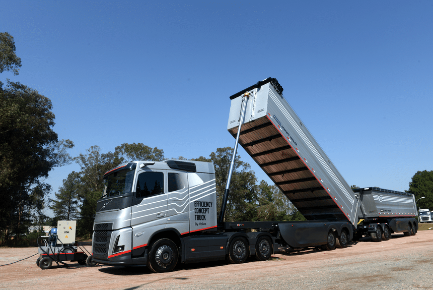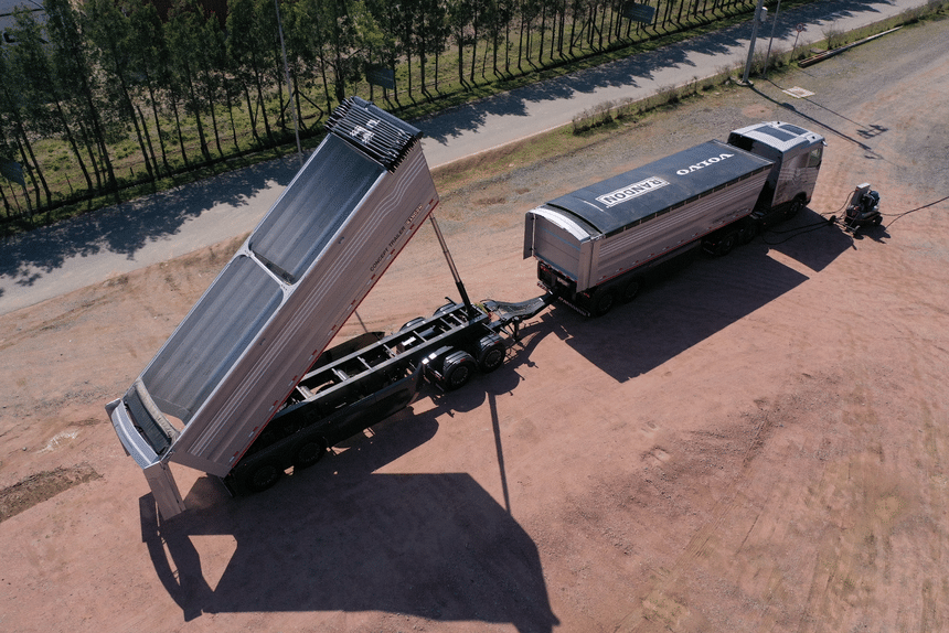Pour ce projet, le carrossier brésilien Randon a développé un train à benne basculante innovant, appelé Concept Trailer. Doté de nombreuses fonctionnalités, cet ensemble semi-remorque + remorque permet d’optimiser les performances et réduire les coûts d’exploitation.