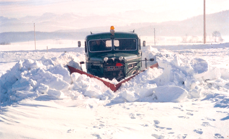 Enfin, pour les nostalgiques, un petit retour en arrière avec ce MAN de Métraux Transports, à Savigny, en Suisse, travaillant dans une belle épaisseur de poudreuse, au tout début des années 60, tantôt en étrave, tantôt en lame biaise. Une mission de viabilité hivernale que les camions de Métraux assurent toujours aujourd’hui, entre autres choses…