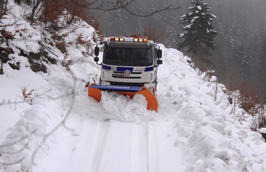Toujours en Autriche, mais cette fois au cœur de l’hiver, ce Tatra Phoenix 4×4 équipé d’une lame biaise tente l’ouverture d’une petite route de montagne.