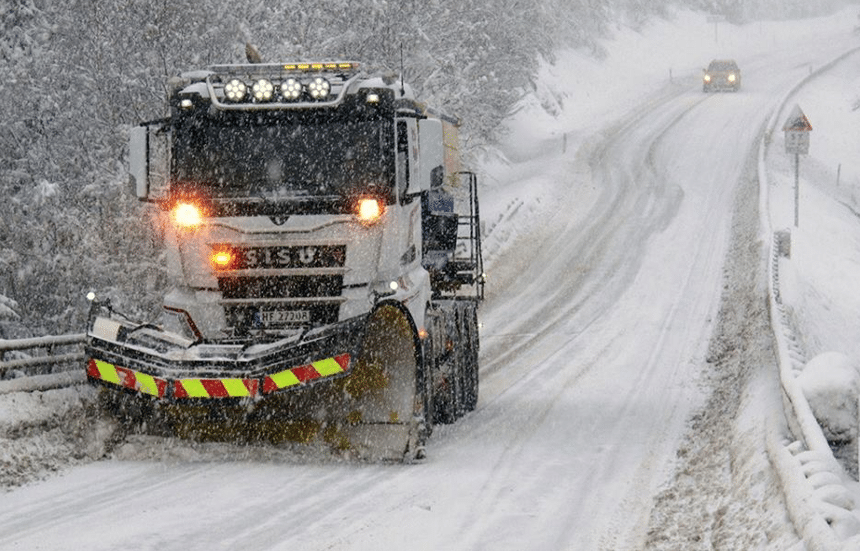 Même travail, même équipement, mais conditions un peu différentes (avec un camion l’étant encore plus), c’est ici un Sisu Polar 8×4 qui opère en Finlande par une journée neigeuse.