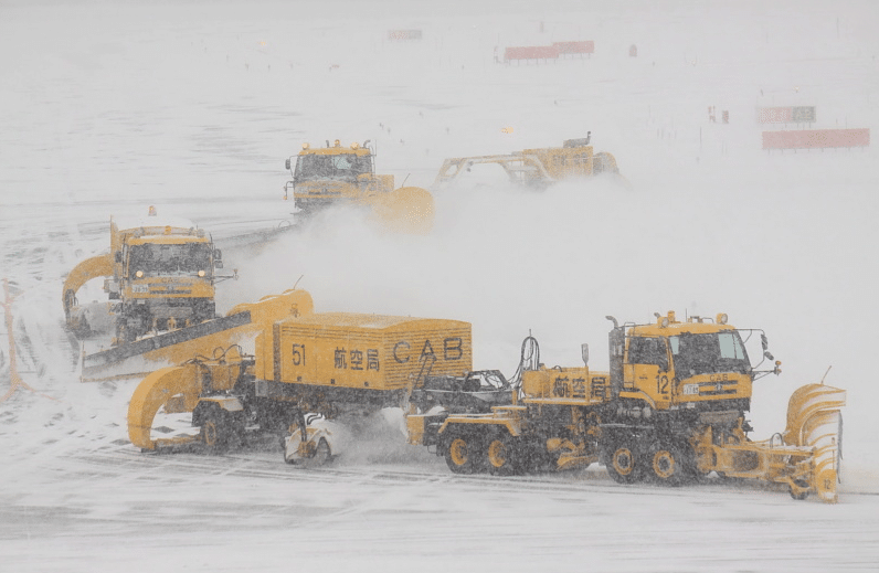 Autres moyens et tout autre enjeu : il s’agit cette fois de garder ouvert, coûte que coûte, un aéroport japonais. Une colonne de chasse-neiges hyperpuissants et suréquipés s’y affaire, chacun pouvant déneiger jusqu’à 6 m de large à chaque passe. Pas moins de douze de ces engins articulés opèrent simultanément pour maintenir l’accès aux pistes et aux taxiways. Les tracteurs sont des UD 8×8 de 520 ch (ex-Nissan Diesel) spécialement conçus pour cet usage.