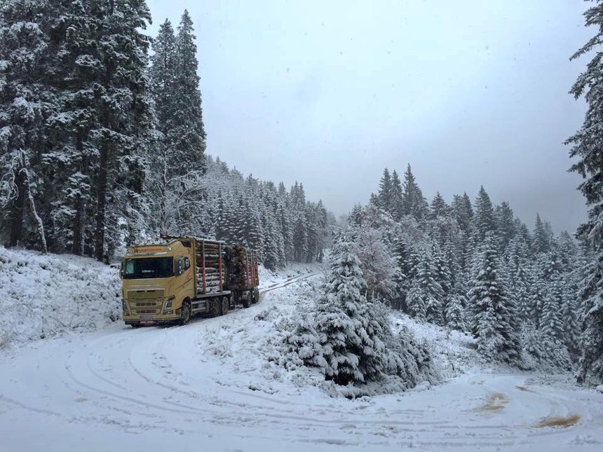 Puis, ci-dessous, c’est la descente dans la vallée d’un Volvo FH grumier autrichien, aux premières neiges.