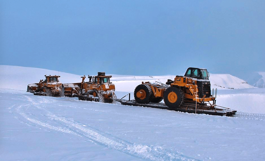 Quelques souvenirs d’hiver, de neige et de glace, pour oublier la canicule. Avec, tout d’abord, une image étonnante : celle d’un dumper Caterpillar 775G, encore dépourvu de sa benne, « faisant de la luge » au Spitzberg. Tiré par deux bulls Caterpillar, il s’en va rejoindre, à travers un vaste champ de neige, le site minier où il doit travailler.