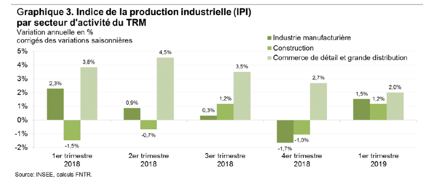 Pour autant, l’évolution des secteurs clients des entreprises du TRM reste positive, présentant même un rebond de la construction. Cependant, la croissance de l’activité manufacturière et du commerce est moindre par rapport au 1er trimestre 2018 (graphique 3).