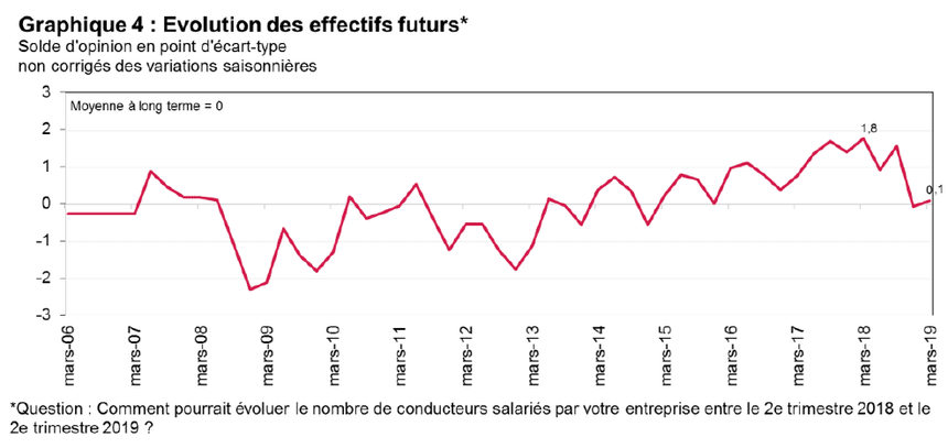 Pour le second trimestre 2019, une majorité de chefs d’entreprises estime que le recrutement des conducteurs restera stable par rapport au second trimestre 2018. Elle est légèrement en hausse par rapport à la moyenne à long terme. A noter cependant que les prévisions des chefs d’entreprises sont plus pessimistes que celles de 2018 sur la même question (+0,1 % au 1er trimestre 2019, contre +1,8 % au 1er trimestre 2018 – graphique 4).
