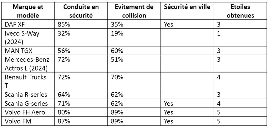 Les tracteurs Scania série G et Renault Trucks T ont obtenu la note de 4 étoiles, tandis que les Mercedes-Benz Actros L, Scania série R, MAN TGX et DAF XF ont tous reçu la note de 3 étoiles. L’Iveco S-Way a obtenu la note la plus basse, avec 1 étoile.
