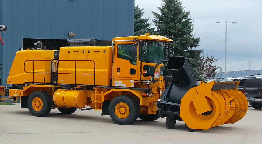 Dans le premier cas, la motorisation arrière sert à l’entraînement du châssis. Typiquement, il peut s’agir d’un Caterpillar C11 de 335 ch. Comme on a affaire à un 4×4, dont la transmission aux roues passe par une boîte de transfert, la position du moteur importe finalement assez peu. L’espace laissé libre jusqu’à la cabine permet l’installation d’un second moteur beaucoup plus gros (par exemple un Caterpillar C18 de 575 ch ou plus) qui, lui, entraîne l’outil de déneigement, fraise ou turbine à neige. Placé au centre du châssis, il contribue par ailleurs à son équilibrage, avec une bonne répartition des masses entre l’avant et l’arrière. Sachant qu’ici, compte tenu du poids de l’équipement porté à l’avant, c’est l’essieu frontal qui présente la plus forte capacité de charge : 14,74 t, contre 11,79 t à l’essieu postérieur.