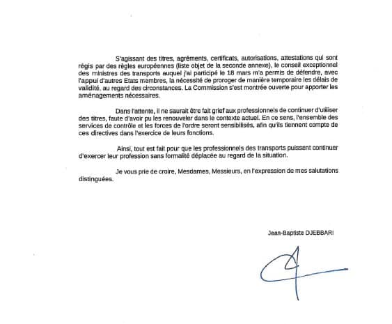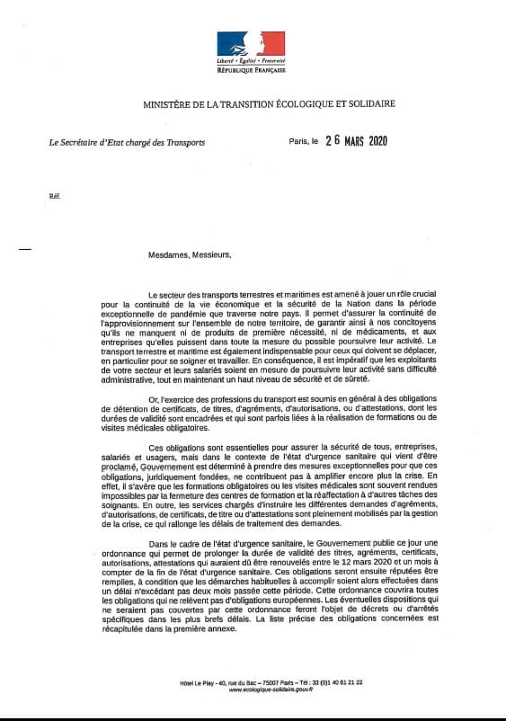 Ces mesures dérogatoires sont justifiées par le secrétaire d’Etat, par le fait que la France est entrée dans un état d’urgence sanitaire. « L’exercice des professions du transport est soumis en général à l’obligation de détention de certificats, de titres, d’agréments, d’autorisations, ou d’attestations, dont les durées de validité sont encadrées et qui sont parfois liés à la réalisation de formations ou de visites médicales obligatoires », explique-t-il en introduction du courrier.