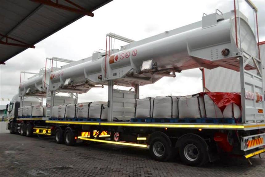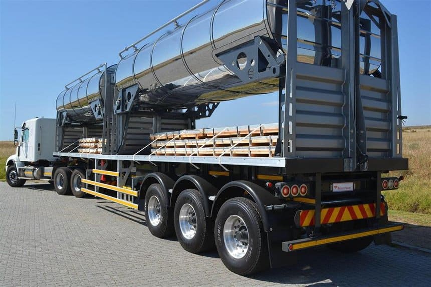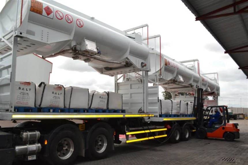 Ainsi, l’entreprise sud-africaine exploitant cet ensemble, transporte-t-elle des hydrocarbures dans un sens et du sel en big-bag dans l’autre. Bilan, pas de retour à vide. Un gain pour l’exploitant, obtenu toutefois au prix d’une certaine perte de capacité pour le vrac liquide et d’un léger relèvement du centre de gravité.
