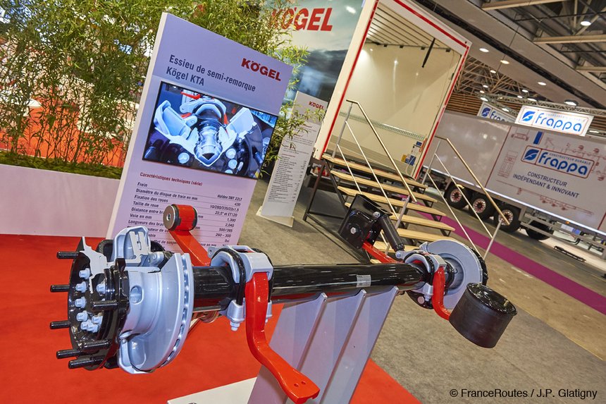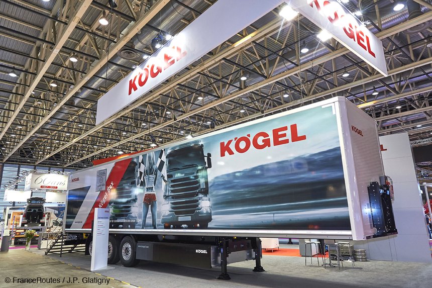 Cette semi-remorque est dotée d’un essieu KTA à double suspension, de conception et fabrication Kögel. L’articulation avant du bras de suspension comporte un palier en caoutchouc qui constitue un premier élément d’amortissement. A l’arrière, le coussin pneumatique joue le rôle principal dans l’absorption des chocs. Kögel dote également ses semi-remorques d’un système de contrôle des pneumatiques détectant les baisses de pression.