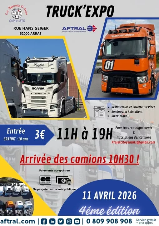 Les apprentis en BTS Gestion des transports et logistique associée (GTLA) et l’association Les apprentis d’Arras organisent le rassemblement de camions Truck'expo, le 11 avril 2026 dans le centre de formation Aftral de la ville du Pas-de-Calais.