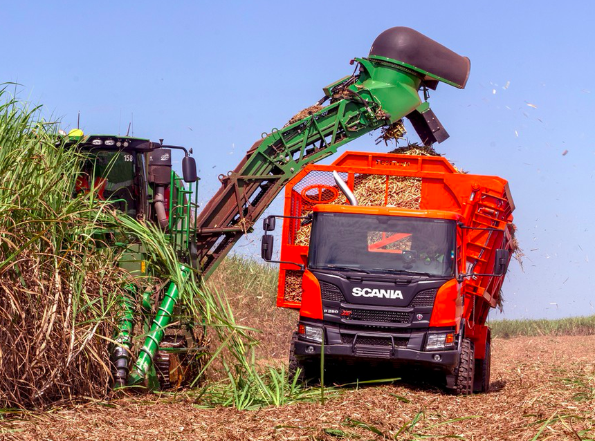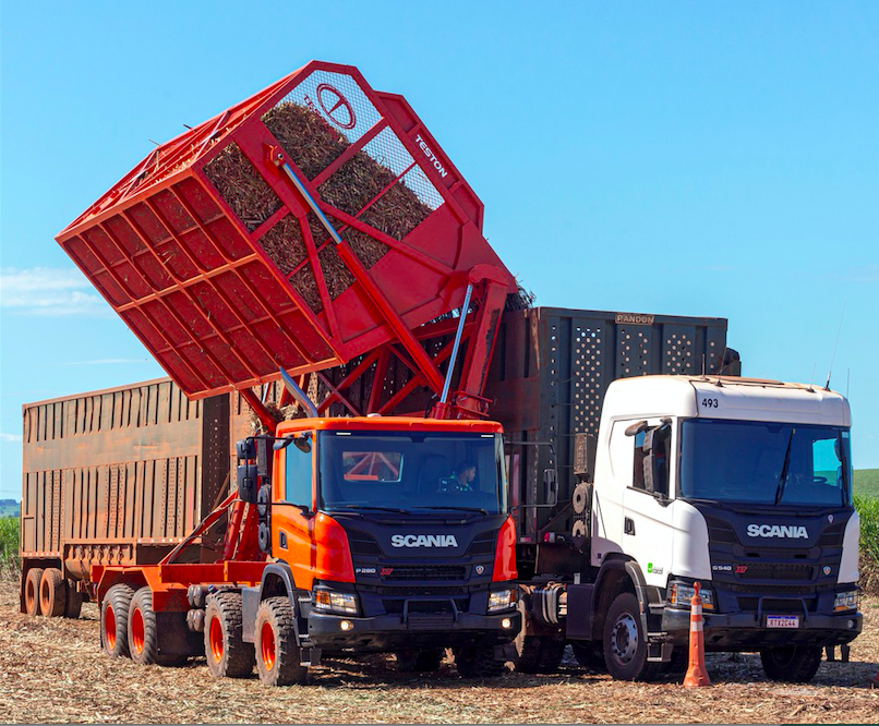 Ce camion assure la liaison entre la récolteuse, qui coupe la canne à sucre, et les ensembles routiers qui acheminent la récolte vers les usines de traitement, notamment des raffineries d’éthanol, carburant très utilisé dans le pays.